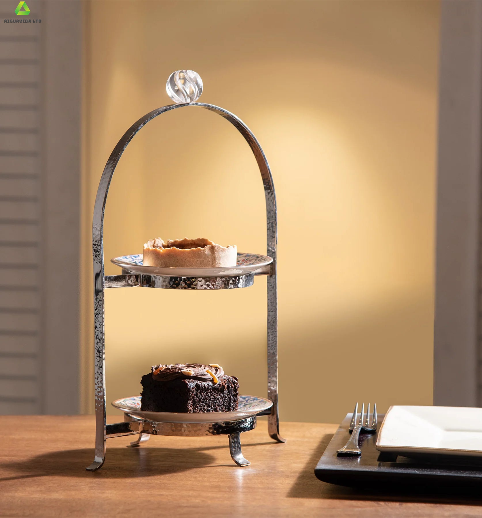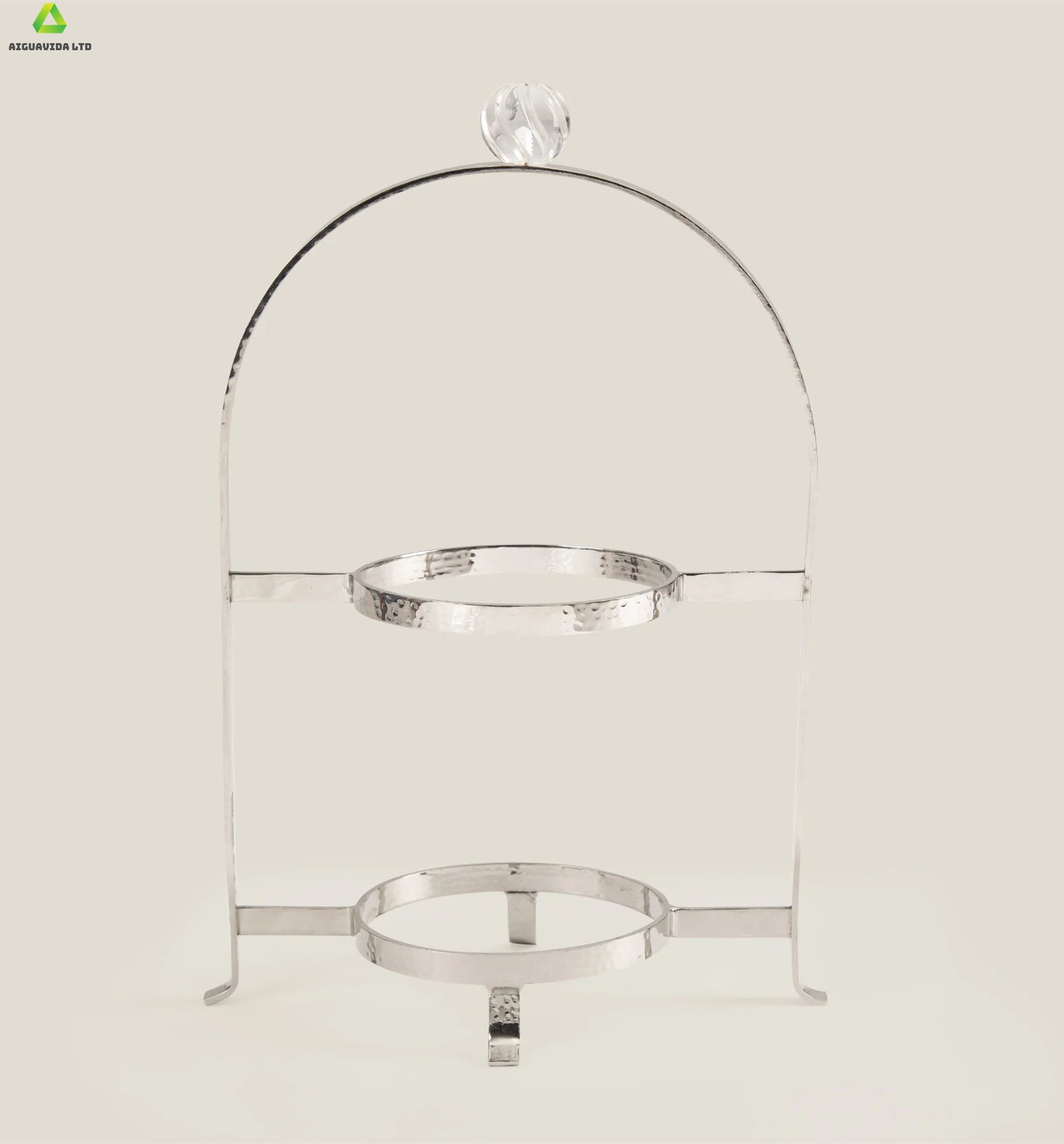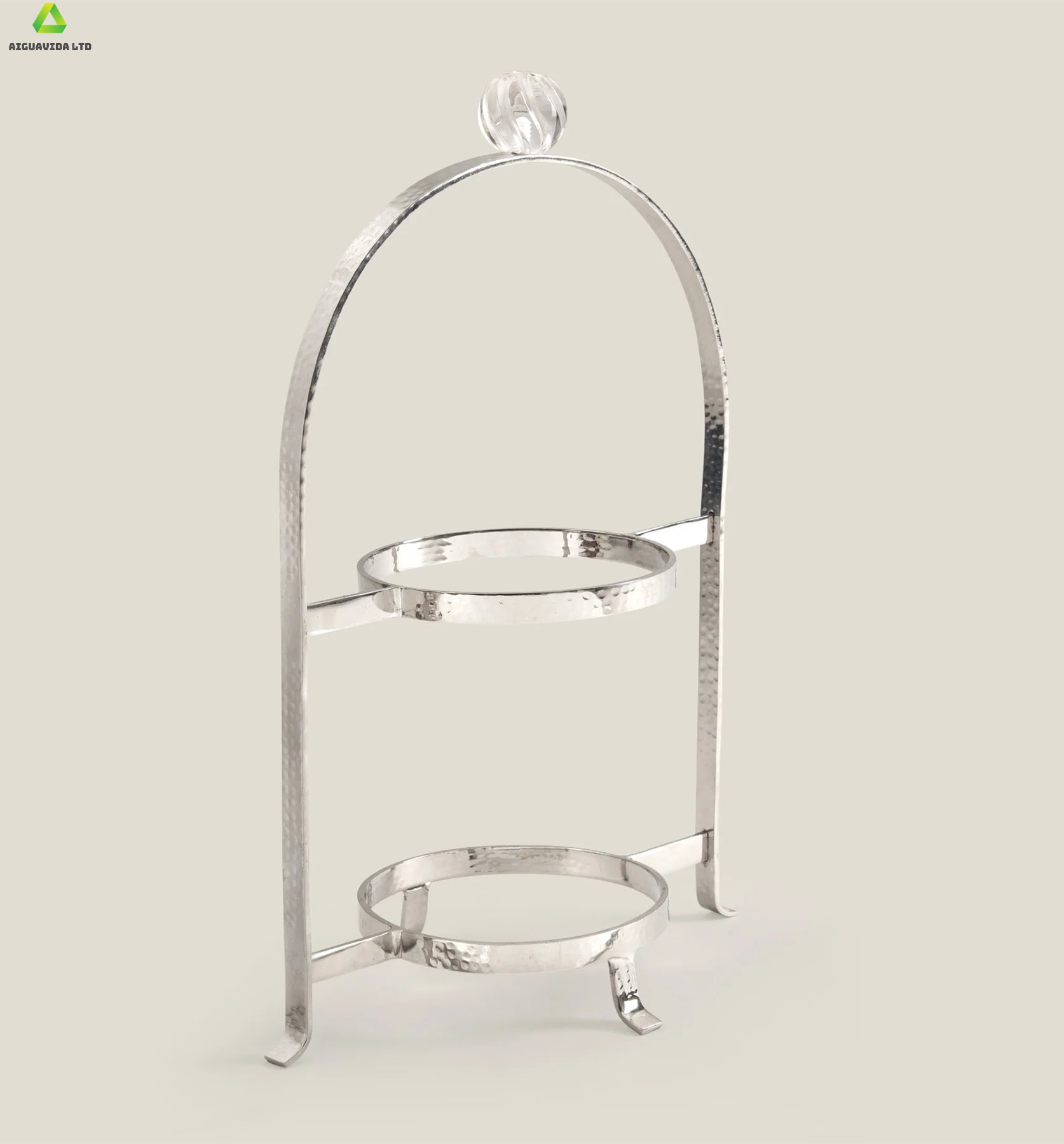 This classic nickel-plated two-tiered cake stand, topped with crystals, is perfect for formal occasions or casual gatherings. Two serving plates rest on a cast metal frame and feature handles for easy access.