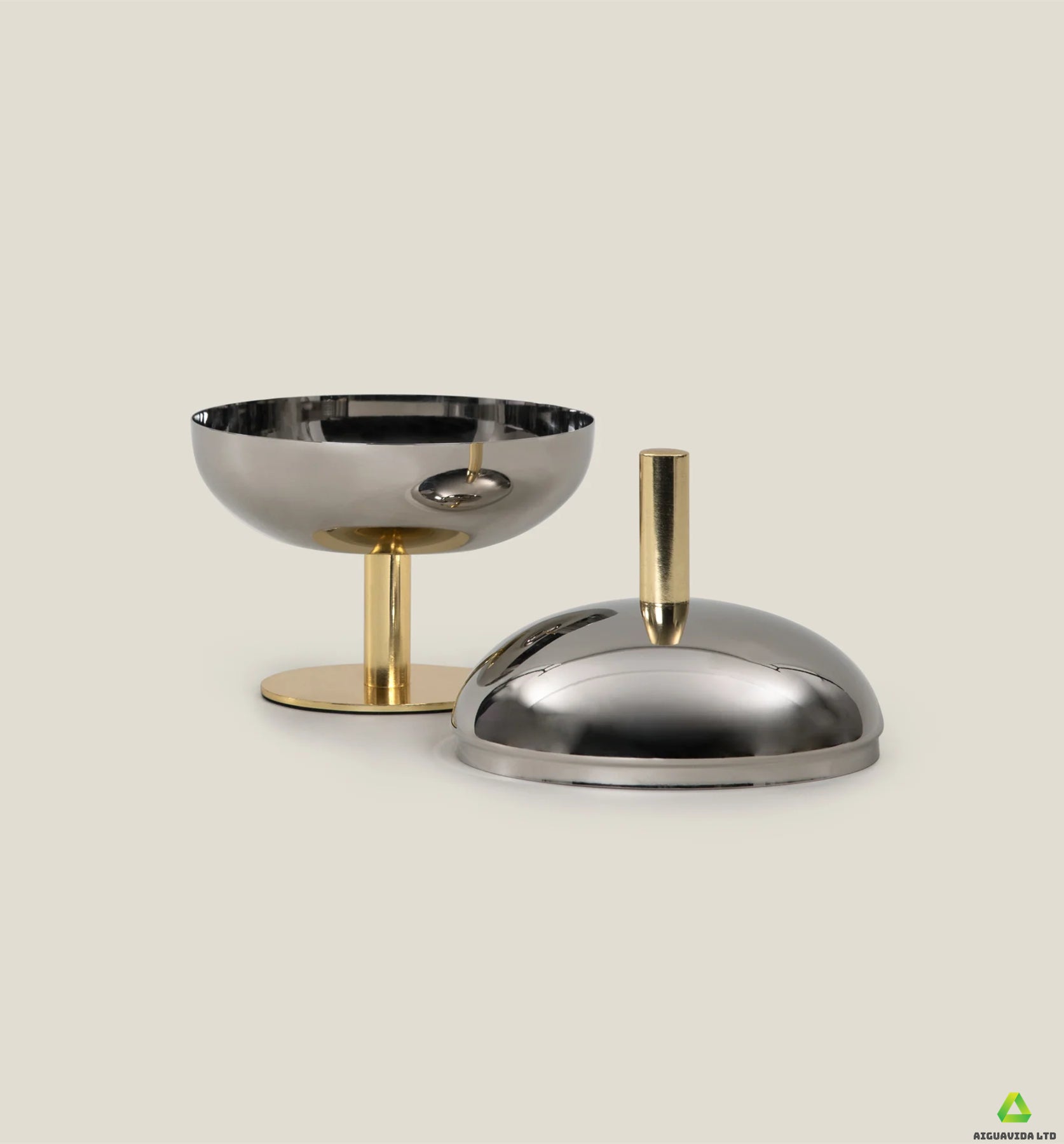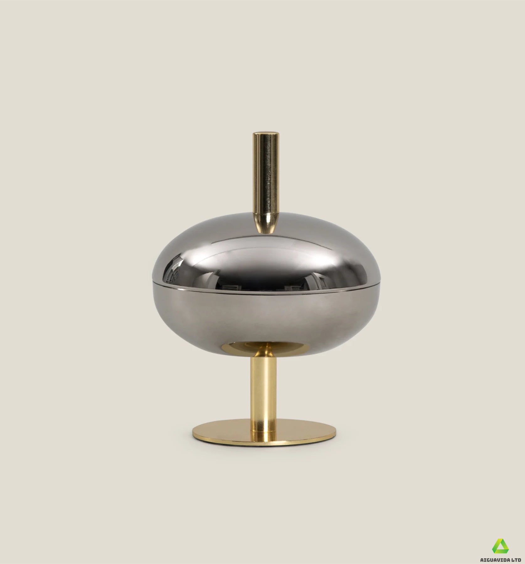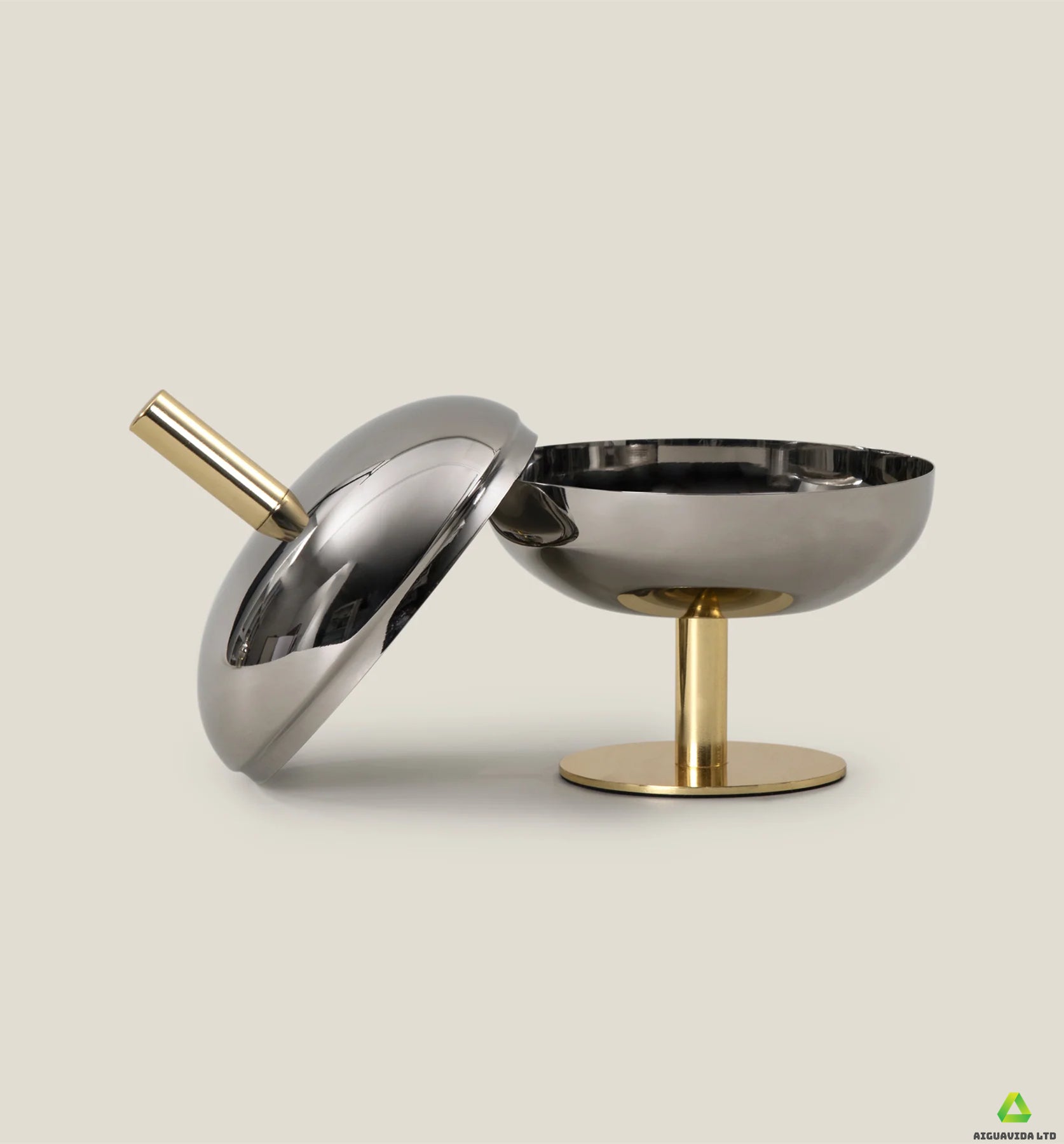 The Ribisi Nut Bowl features a unique oval design, resembling a curled sphere. This elegant vessel is composed of two parts, with a perfectly proportioned base and lid. The bowl features a bright nickel finish, while the base and stand feature a gleaming gold finish. A stylish and practical gold handle extends from the lid for easy opening. It adds a touch of luxury to your everyday tableware.